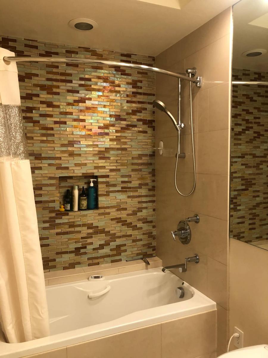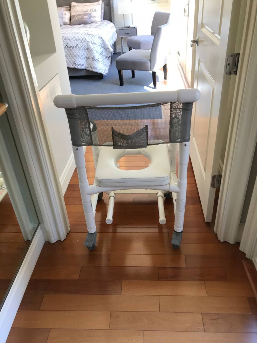 The roll-in shower is barrier-free with two shower-heads, including a hand-held shower nozzle. There is no threshold or step between the shower and bathroom floor. A portable shower wheelchair is also provided for the roll-in shower. Next to the roll-in shower is the handicap accessible tub, which has a Jacuzzi feature along with an emergency evacuation system just in case. The other bathroom has a bathtub-shower combo with a hand-held shower nozzle, and no other modifications.