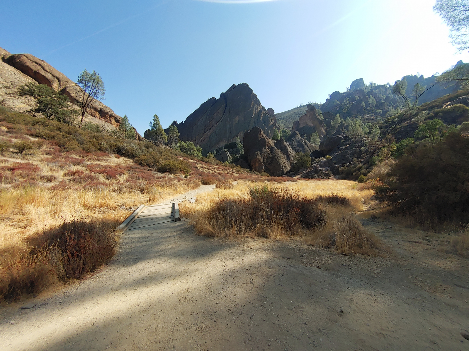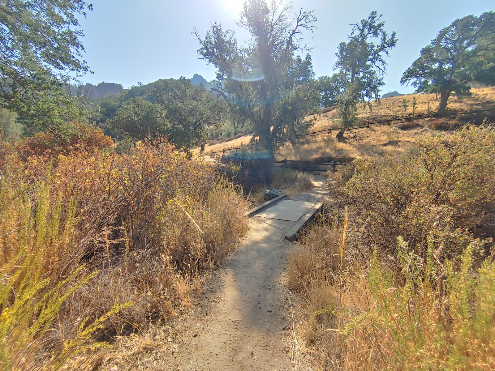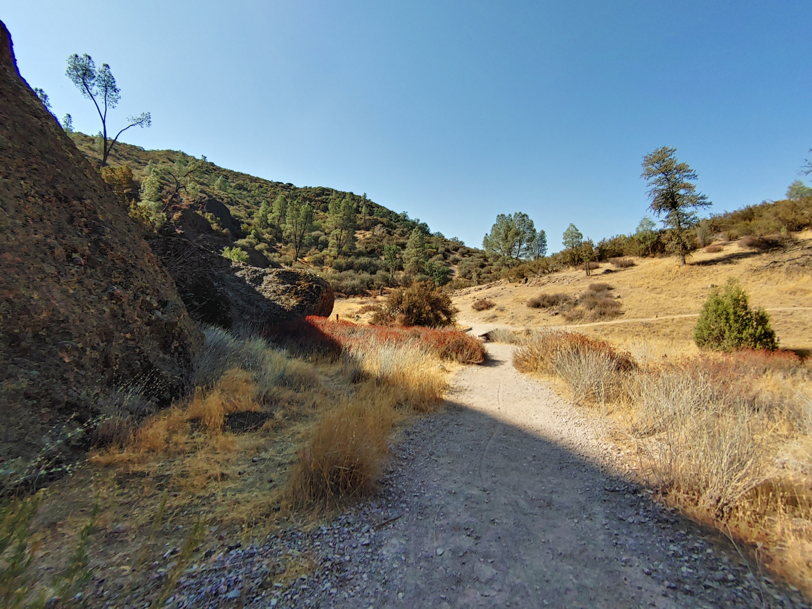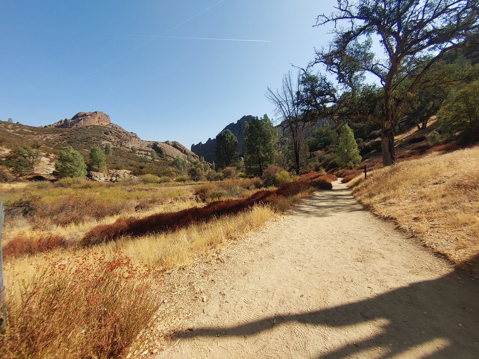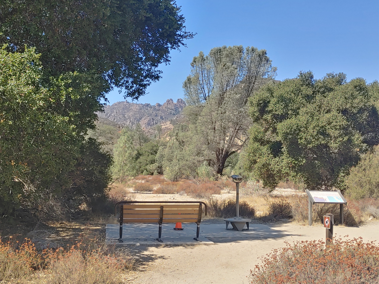 The east side of the park is in the valley of the mountains. Following the Pinnacles Parkway Road with views of the peaks and a dry creek bed is the one-way Sycamore Valley Trail with a hard-packed dirt surface. Most of the trail is exposed to the sun, though a few parts are shaded by nearby trees. Look out for soft sand or rocky spots. When the trail veers off this main road towards Bear Gulch, it becomes inaccessible; the Bear Gulch visitor center is also inaccessible. Instead, continue hiking along the dry creek on the Bench Trail from the Manzanita Parking Area.