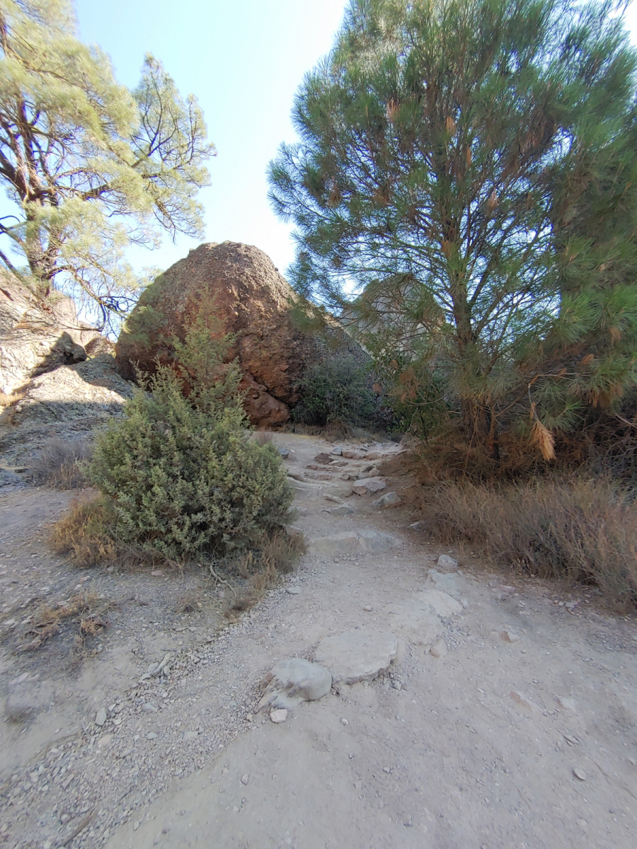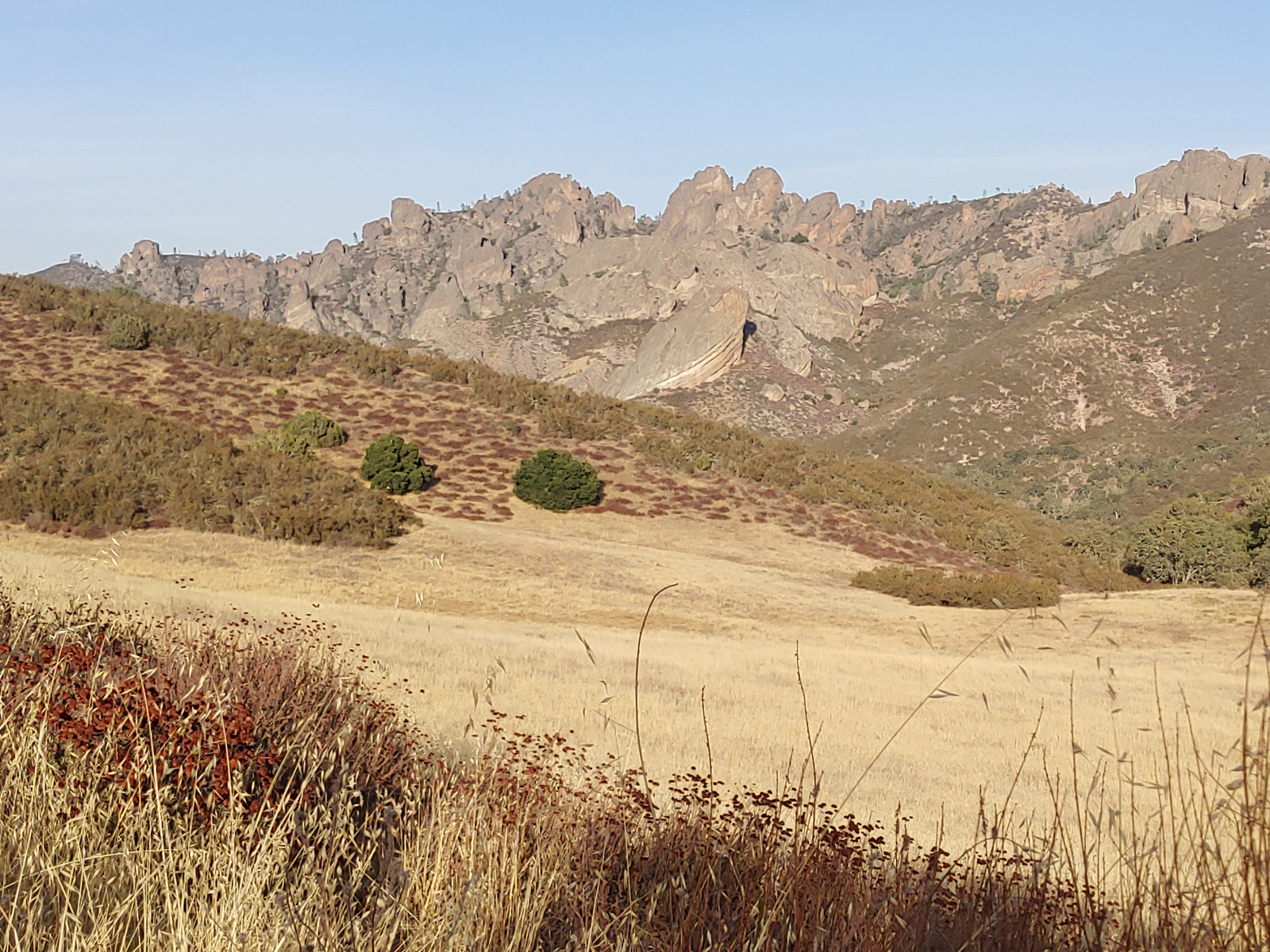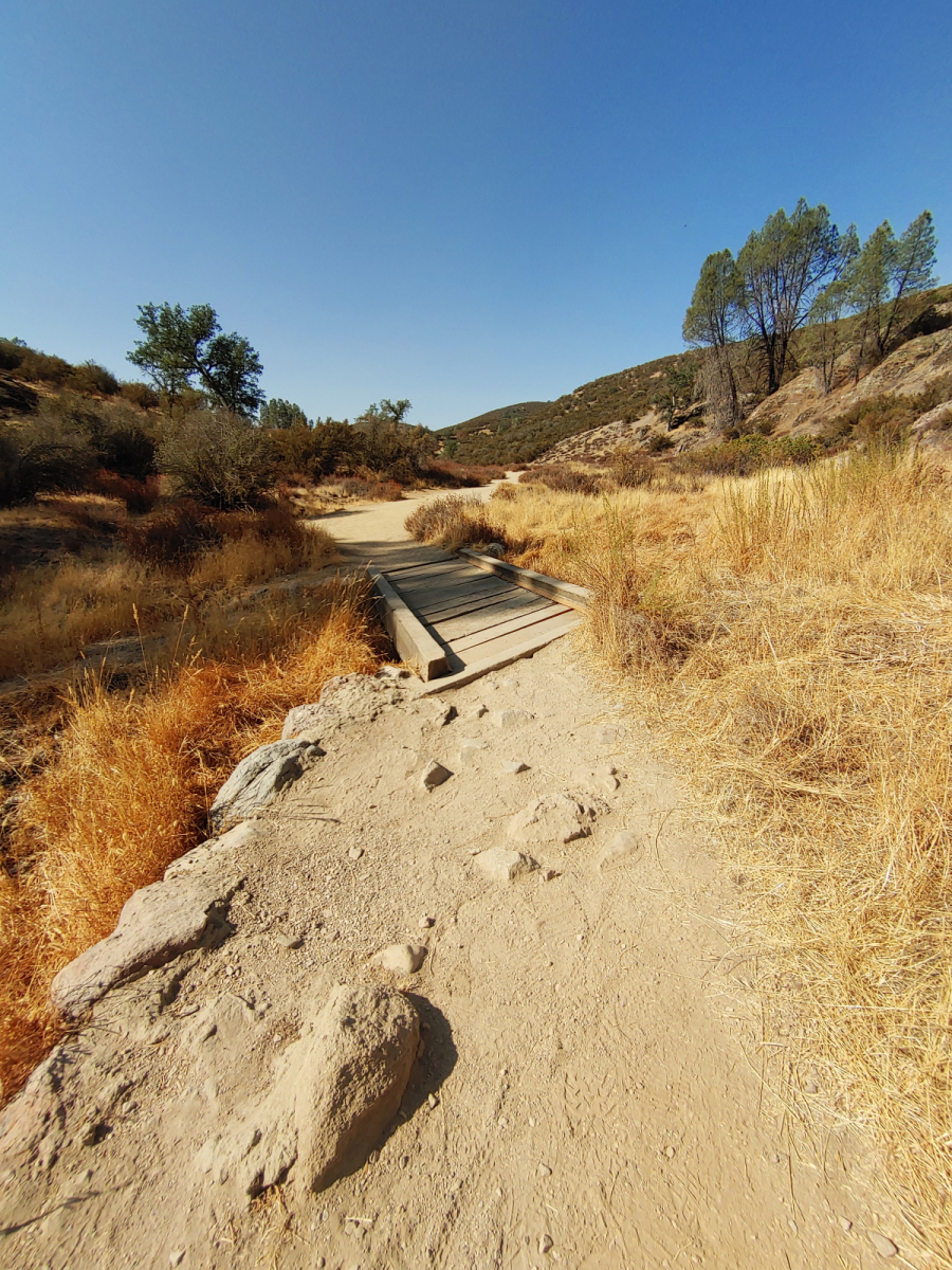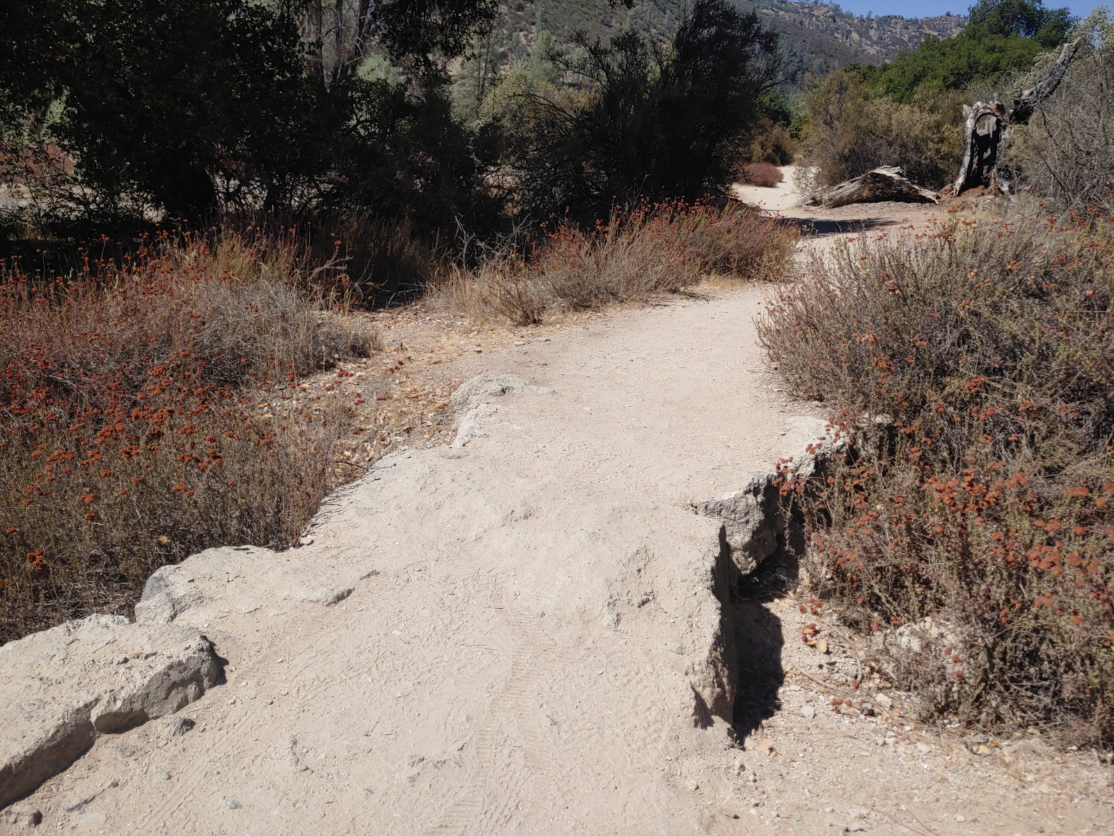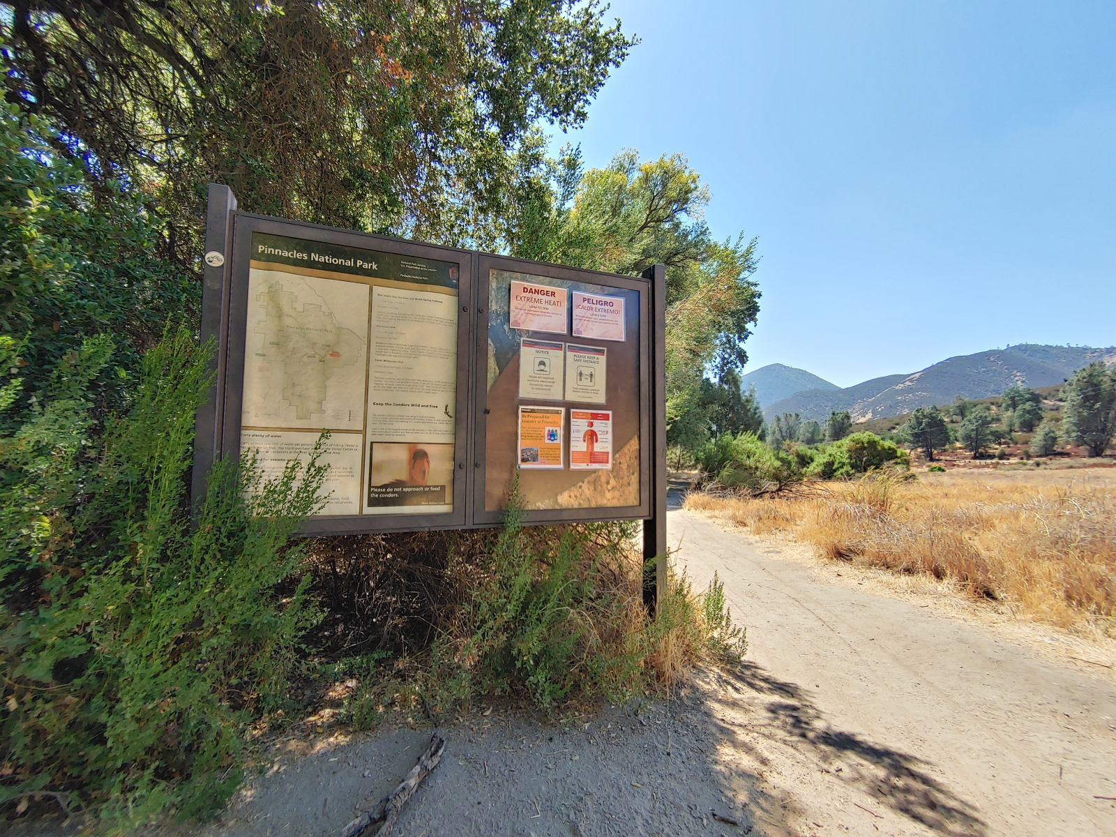 The east side of the park is in the valley of the mountains. Following the Pinnacles Parkway Road with views of the peaks and a dry creek bed is the one-way Sycamore Valley Trail with a hard-packed dirt surface. Most of the trail is exposed to the sun, though a few parts are shaded by nearby trees. Look out for soft sand or rocky spots. When the trail veers off this main road towards Bear Gulch, it becomes inaccessible; the Bear Gulch visitor center is also inaccessible. Instead, continue hiking along the dry creek on the Bench Trail from the Manzanita Parking Area.