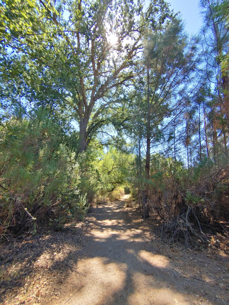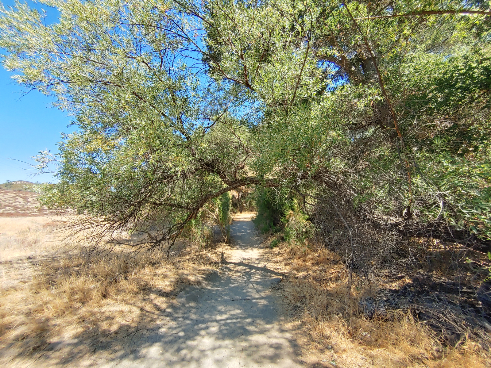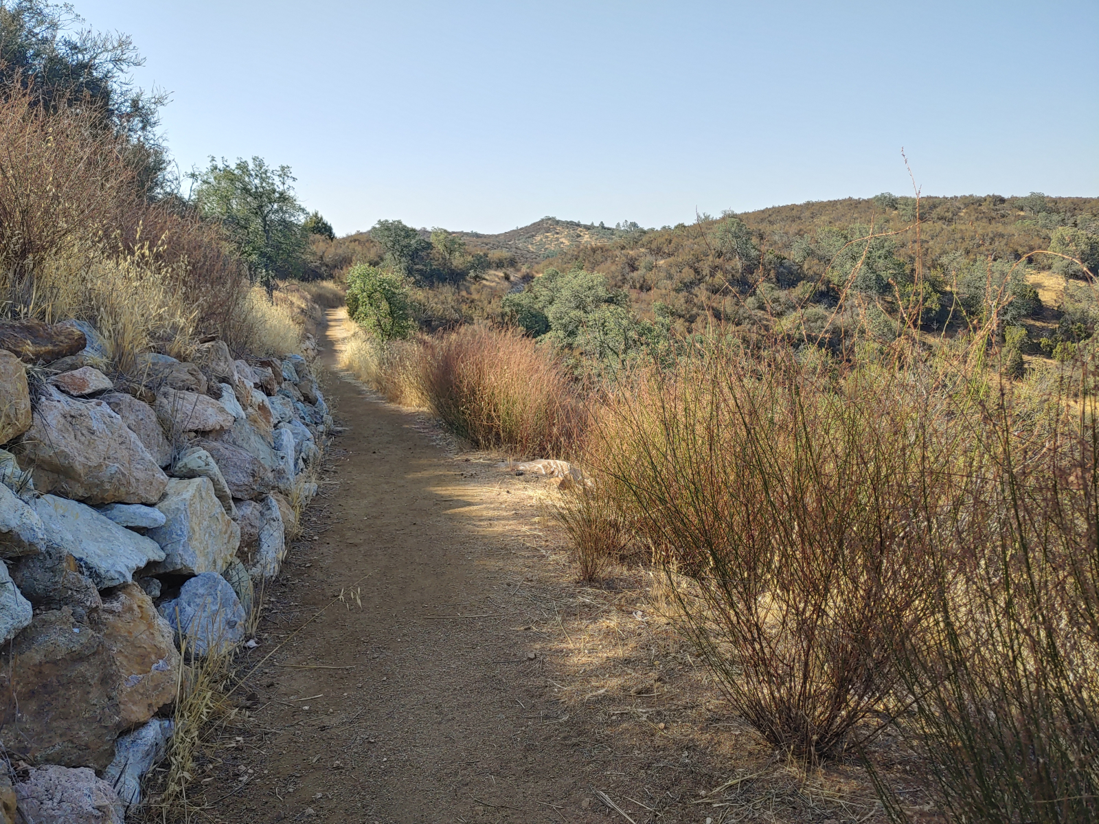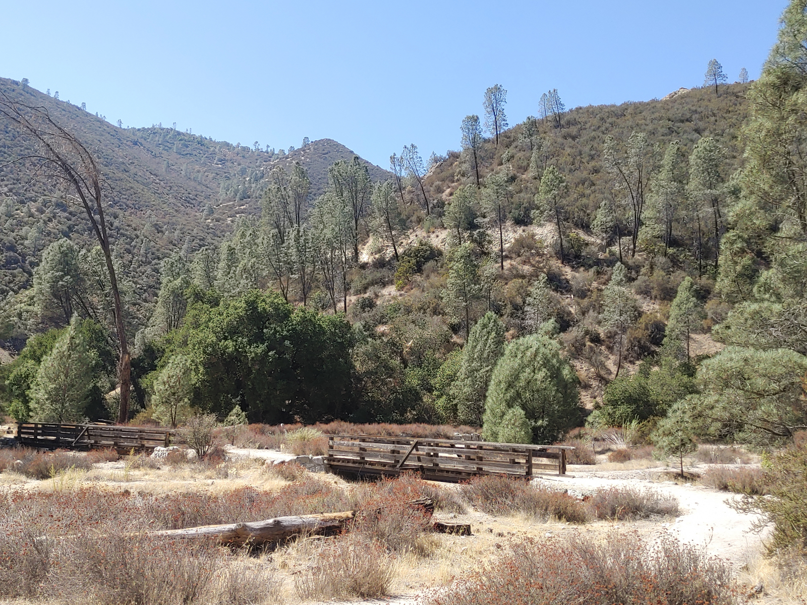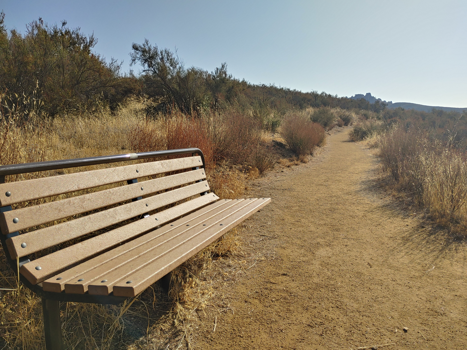 The east side of the park is in the valley of the mountains. Following the Pinnacles Parkway Road with views of the peaks and a dry creek bed is the one-way Sycamore Valley Trail with a hard-packed dirt surface. Most of the trail is exposed to the sun, though a few parts are shaded by nearby trees. Look out for soft sand or rocky spots. When the trail veers off this main road towards Bear Gulch, it becomes inaccessible; the Bear Gulch visitor center is also inaccessible. Instead, continue hiking along the dry creek on the Bench Trail from the Manzanita Parking Area.