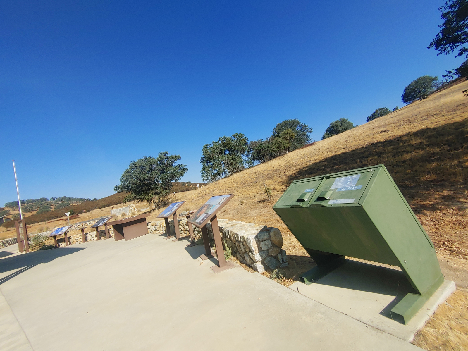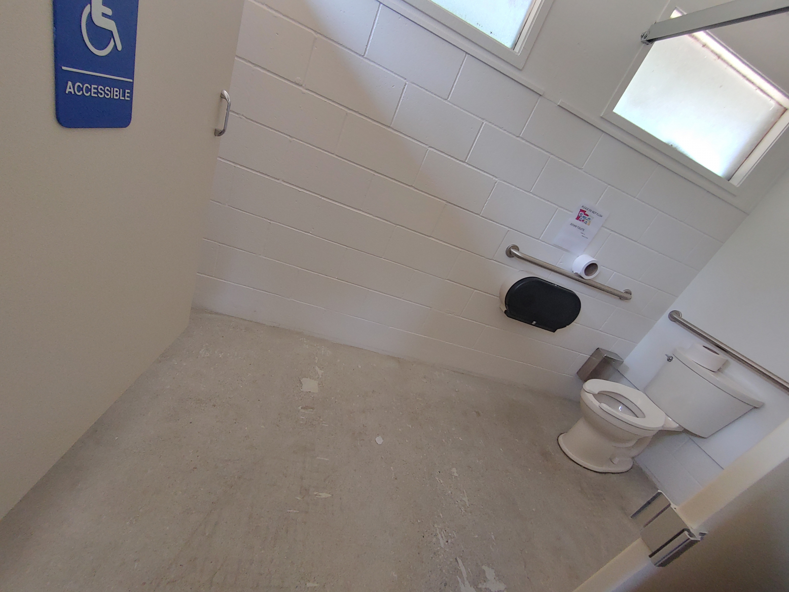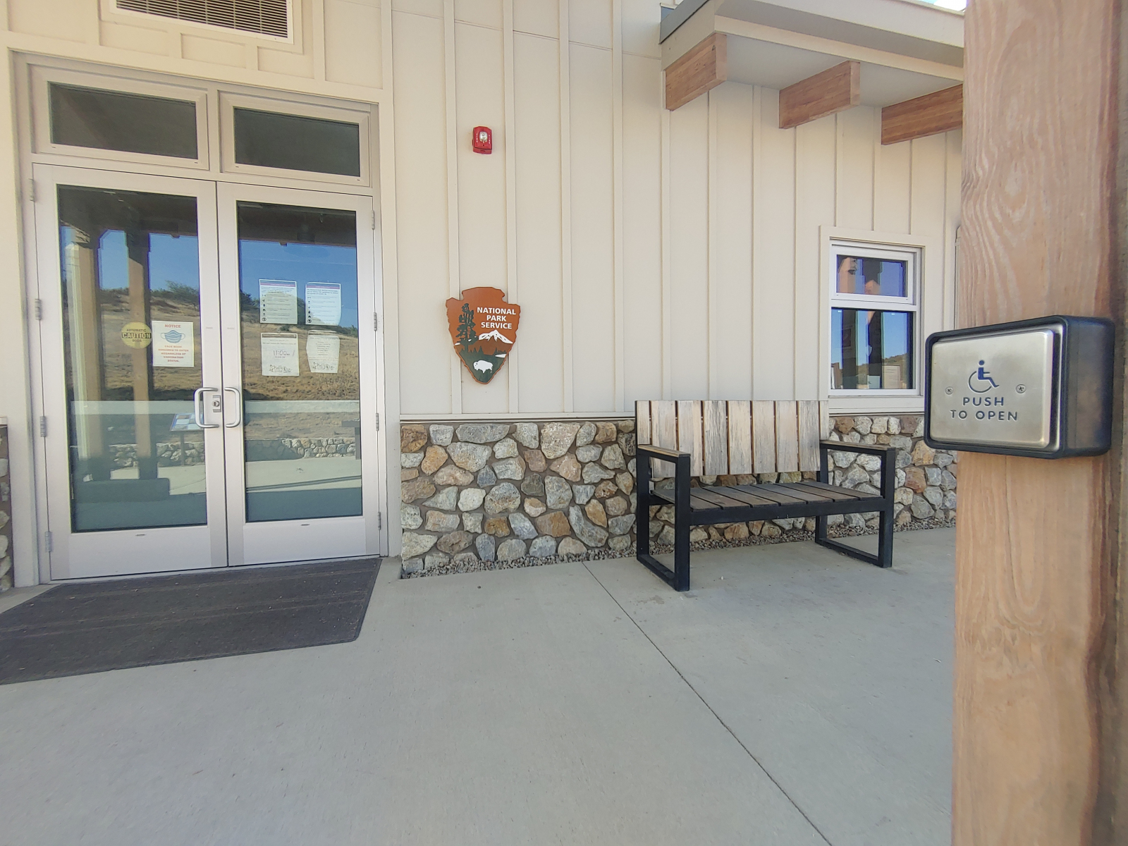 This area has accessible parking and access to a drinking fountain and observation telescope. The picnic area is on a hard-pack dirt surface with no modified picnic table, but deepening on height, some people may be able to fit under the table at the end. The flush toilets here are not wheelchair accessible, so a portable toilet out-front has been provided.