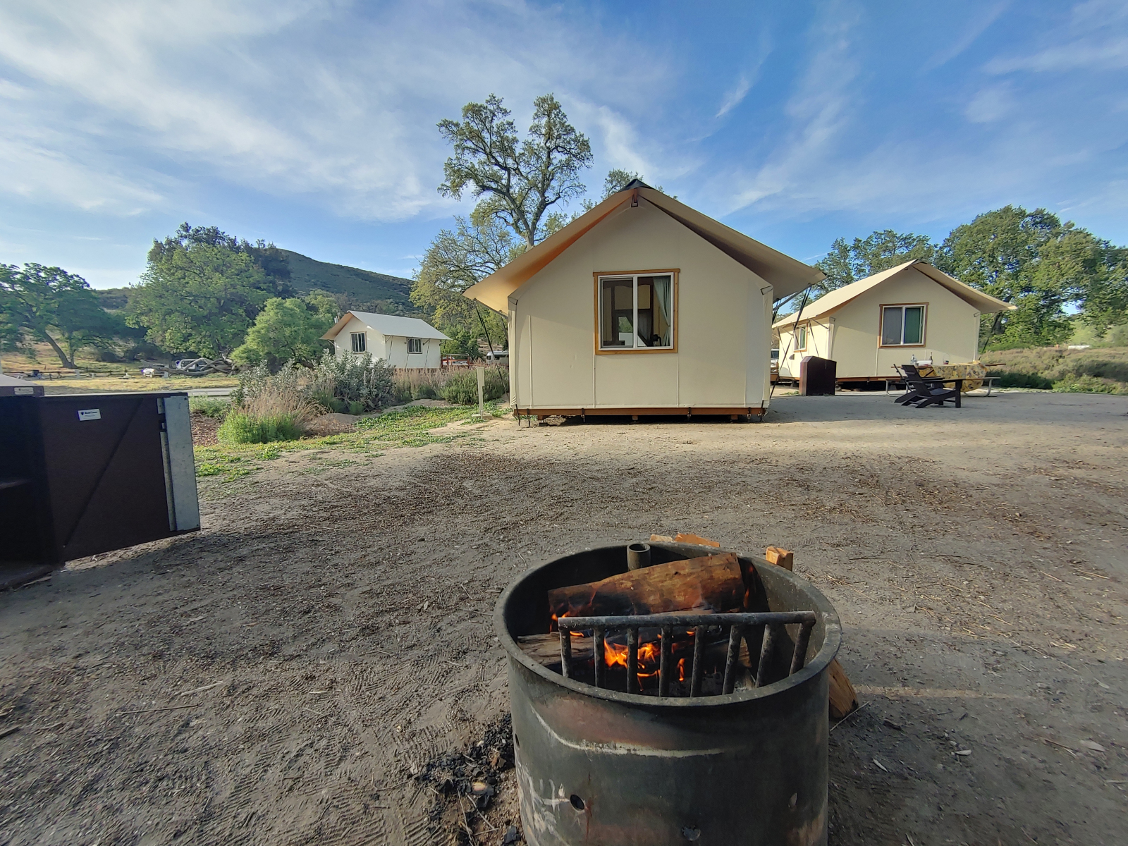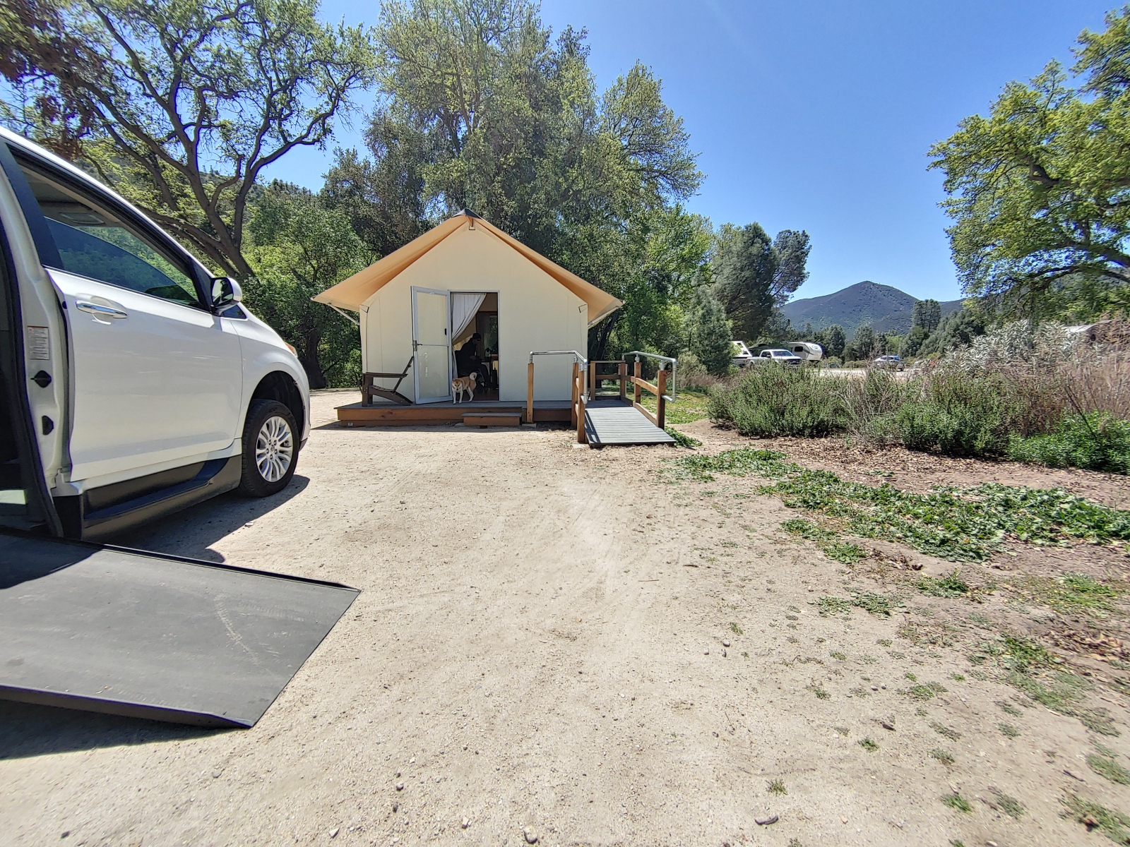 Though the campgrounds are in the park, they are operated by another company. Several campsites have tent cabins with a ramp, picnic table with an extended end, a raised fire-pit, and barrier-free ‘bear box’ to store food. Inside were two twins and one full-sized bed on hardwood floors along with a chair, sliding windows, a lantern, and a small heater. A couple of power outlets are also inside. The only barrier to these tent cabins is the threshold between the ramp and ground; some had a significant space that would block a smooth transition if using a wheelchair. Filling this gap with another board or dirt solves this barrier.