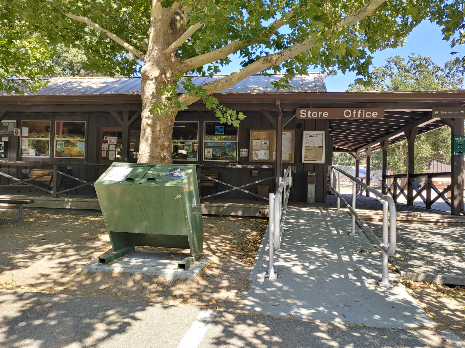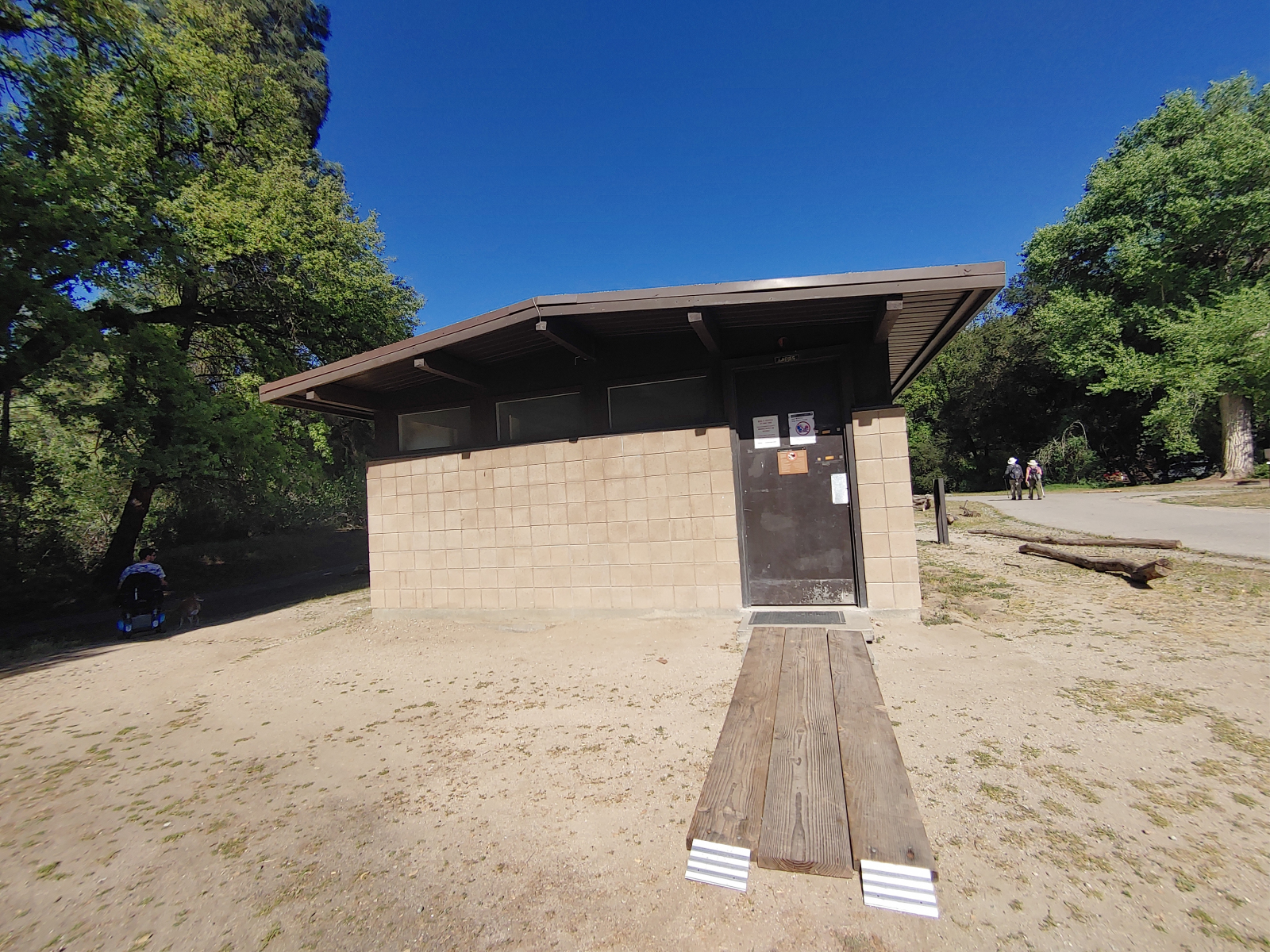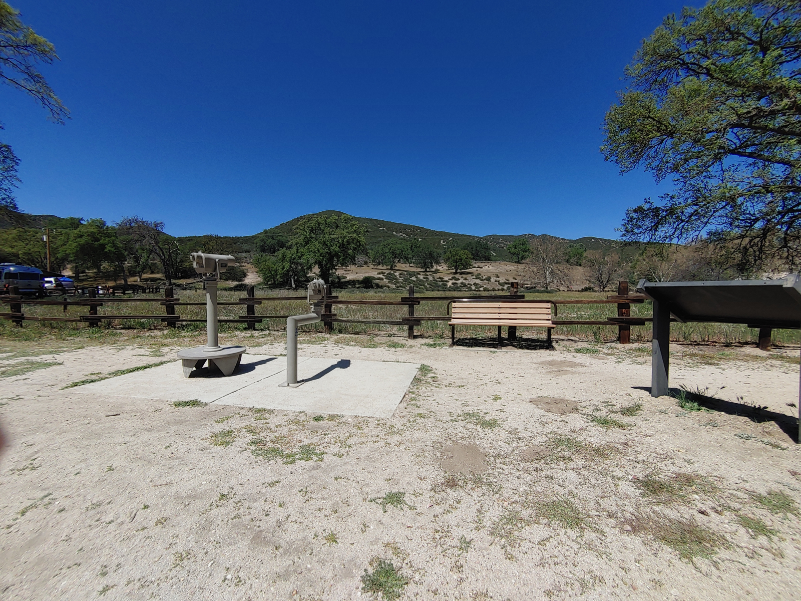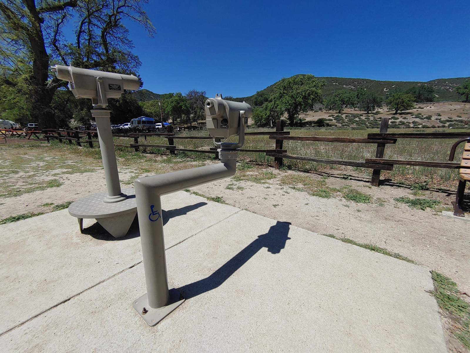 A short stroll from the campground store is a California Condor viewing area with two sets of binoculars on a paved platform, and one is wheelchair accessible. A bench is feet away. The campground store has a designated handicapped parking spot next to an accessible portable toilet. One flush toilet is accessible in the campgrounds with a larger stall and grab-bars, but currently, the building does not have a ramp to get inside. (We set up wooden boards when visiting.) Shower facilities at the park are not accessible.