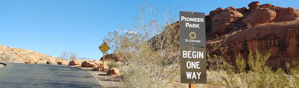A little closer to the entrance of Pioneer Park is the Pioneer Park Trailhead. From a non-accessible parking spot on the end, we wheeled down the incline on the smooth asphalt road to the trailhead. The first portion of the trail is firm, level, and made up of crushed rock and dirt. This section is possible for someone in a manual wheelchair and is a scenic stroll through a canyon of red rocks.