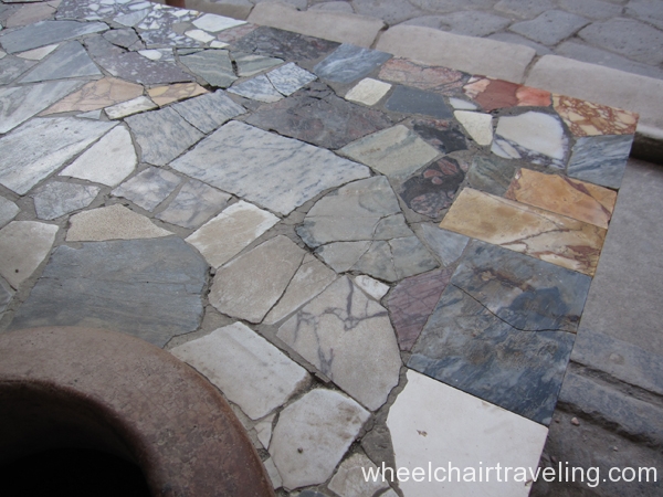 We went to Pompeii in June 2012. There is an ongoing major project to make parts of the archaeological site wheelchair accessible, creating an accessible route called Friendly Pompeii. Although only a fraction of the site is accessible, a visit is worthwhile. Allow two to three hours to see the accessible areas. Because of the heat and sun, a late afternoon visit is advisable; at that time the antiquities are beautifully illuminated by dazzling sunlight but it’s not overwhelmingly hot. Many of the surfaces are dirt, gravel, and rock. They can become muddy after rain, so avoid going after it’s rained.