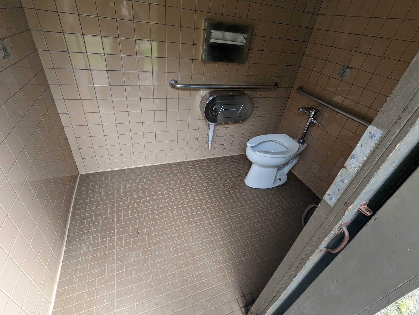 By parking lot at Skyline Gate Staging Area. The accessible restroom is at Canyon Meadows at the start of the trail (across the first meadow); all others either have limited or no access. The toilet is a flush toilet and there is no sink, so bring sanitizer. The door slides shut with a handle.