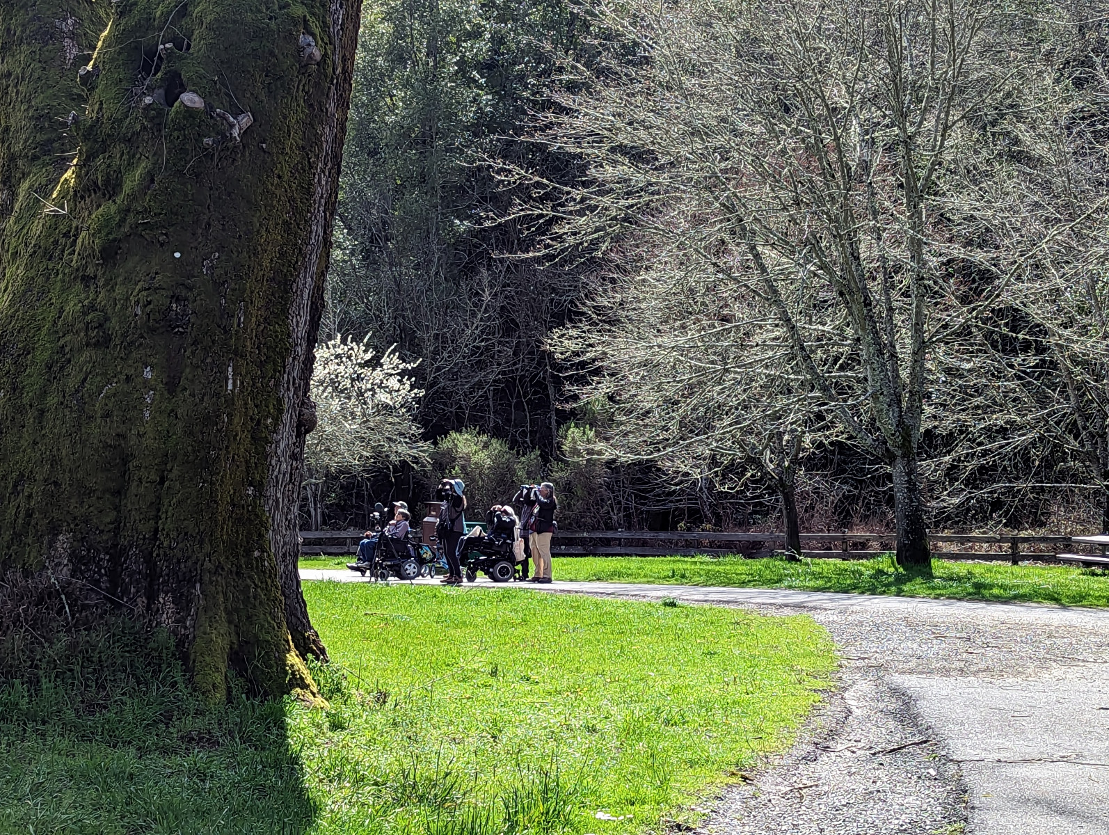 Open space and limited views of the surrounding hills quickly give way to a shade filled forest filled with occasional birdsong–first you’ll pass a few picnic areas and an accessible play structure. After about a quarter-mile an accessible bridge crosses the creek, an interpretive panel tells of the native rainbow trout, and immediately following is a junction to Bridle Trail, an enjoyable half-mile trail that hugs the hillside and is worth doing on the return. Continue on the Stream Trail to a small redwood grove followed by another picnic area at Trail’s End with a large covered structure whose purpose wasn’t clearly evident to me. The asphalt ends here, but the trail should be manageable for some wheelchair users for another quarter mile, where, past the junction with Fern Trail, it becomes quite steep. We also attempted Mill Trail but turned back after a few hundred feet