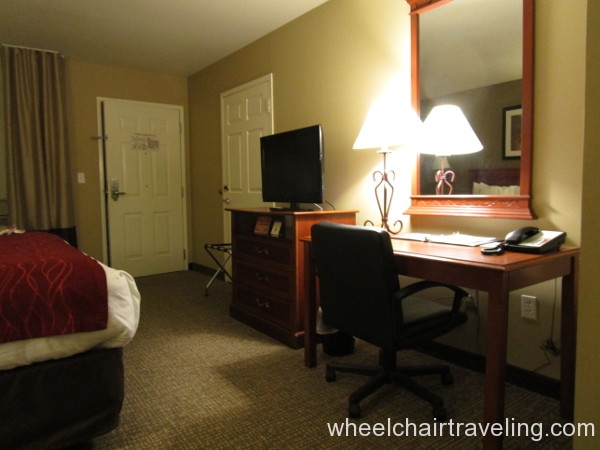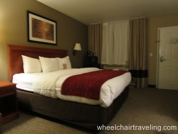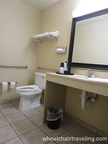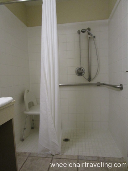 Stayed in room 111; king bed with roll-in shower. Doorways are 36″ or wider. The door opens with the key card and there is a lowered peephole in the door. The room has ample space to access either side of the bed, but the bed is a bit high (estimate 25-26″). The desk and bath vanity are appropriate heights for wheelchairs. Roll-in shower has a removable plastic shower bench with a back and hand-held shower head. The towel rack and tissue box mounted on the wall behind the toilet are too high. The closet pole is too high. Other room amenities like a TV remote, coffee pot, power outlets, temperature controls, hair dryer, refrigerator, and microwave are within reach.