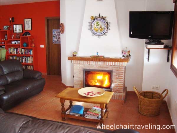 Entering through the main front door, you will come into living room, which is a large open plan area, the dining table seats eight. The living area has a large glass fireplace (wood is included in the house rental), flat screen TV, two sofas, and a coffee table. Another two-seater sofa and two wooden armchairs are arranged alongside the opposite, book-lined wall to form a cozy reading corner. There is a huge selection of books and movies. The TV also has a media player with films, TV box sets, etc. From the living room there is a door to an interior Spanish style patio courtyard with a pretty water feature in the middle.
