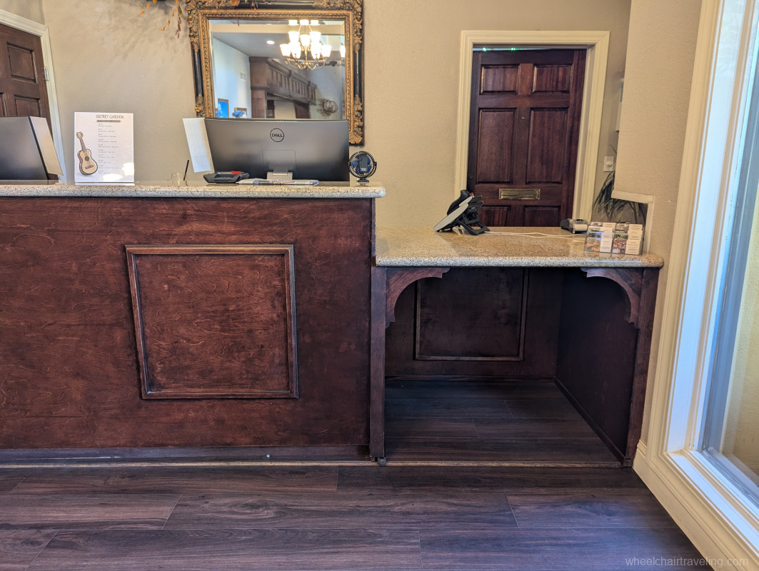 Guests arrive at the main building, which houses the check-in desk. The desk features a lowered section to accommodate wheelchair users, ensuring a welcoming and accessible experience from the start. Doors to the main building are not automatic.