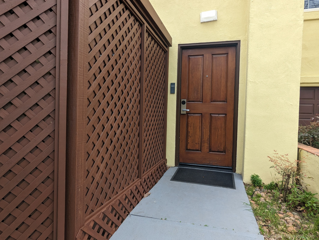 The Standard King – Accessible – Dog Friendly room #302 is a first-floor studio with a two-seat sofa. The bathroom is equipped with handrails, a roll-up sink, and a zero-threshold shower with a handheld showerhead and mounted bench. Guests can also enjoy a private enclosed patio with a pre-filled mineral hot tub equipped with a remote-controlled lift. This room includes a fireplace, complimentary bottled water, a coffee maker, and refrigerator. Additionally, it is dog-friendly, offering water bowls, a dog toy, and dog beds. The the air thermostat is lowered, and accessible parking is conveniently located adjacent to the room. A microwave is available upon request.