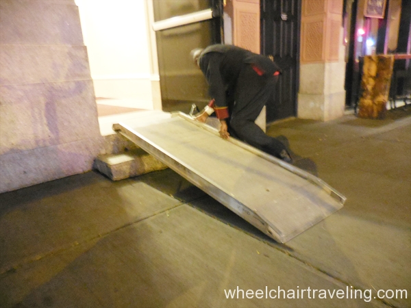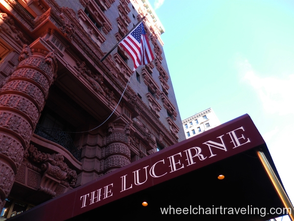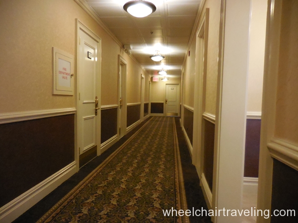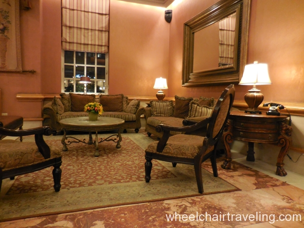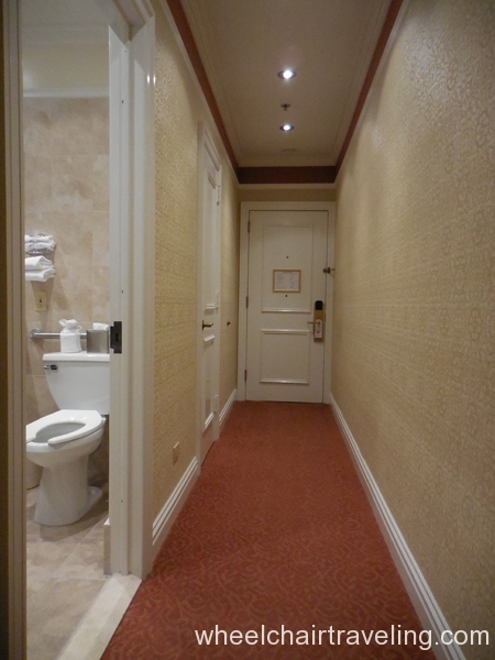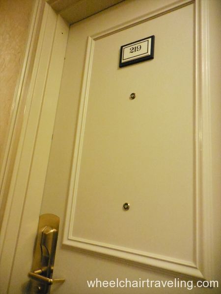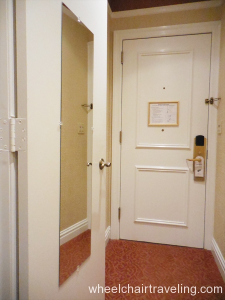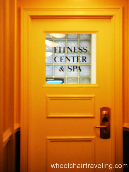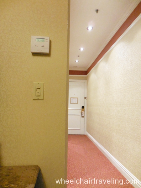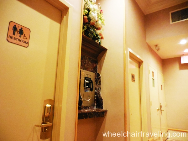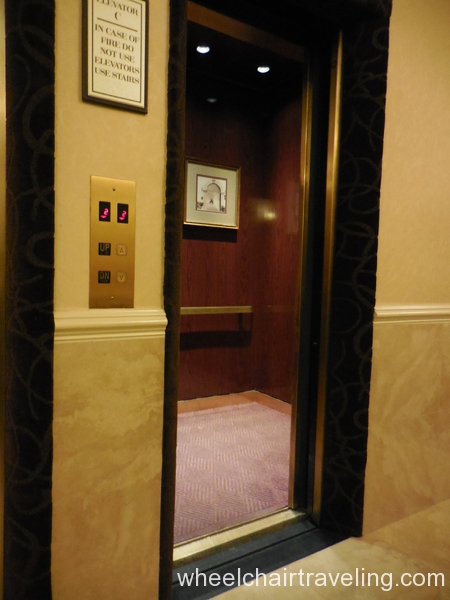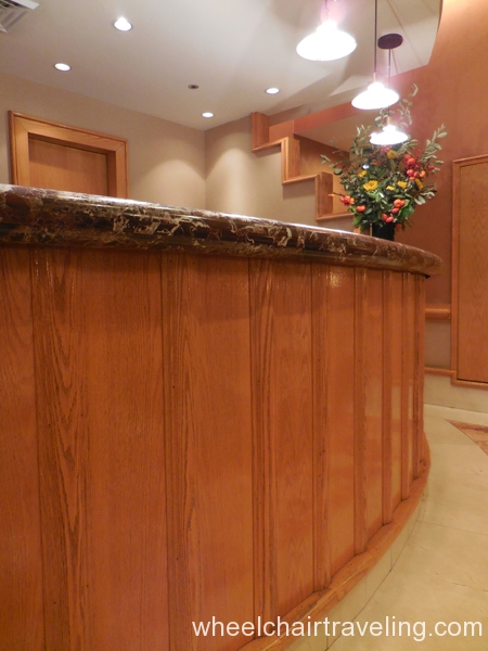 At first glance the hotel doesn’t look accessible with multiple stairs in the front, but a doorman is always there and will bring out the ramp to side entrance real quick. When wanting to leave the hotel you can notify the doorman or front desk, so there is never any worry about opening the door. Inside is the lobby of the hotel with a waiting area, the concierge desk and check-in desk with no modifications. Around the corner is an accessible unisex bathroom and two small elevators that carry guests up to the rooms as well as the fitness/spa.