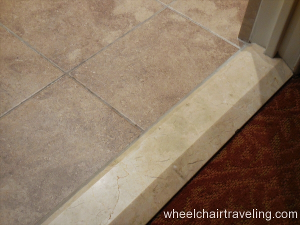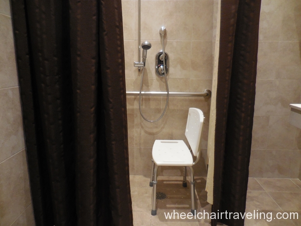 The doorway lip into the bathroom is something to be aware of. The back of the door has a lowered hook. The toilet has grab-bars and the sink is a roll-up. The towel rack was also awkward to reach and could be lowered for better access. The roll-in shower with a portable bench and hand-held shower nozzle lacked a shelf for toiletries, which was very inconvenient.