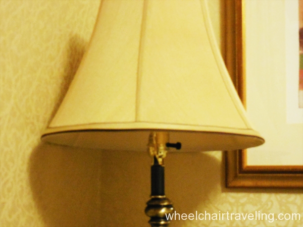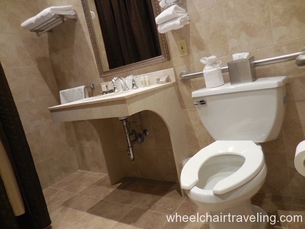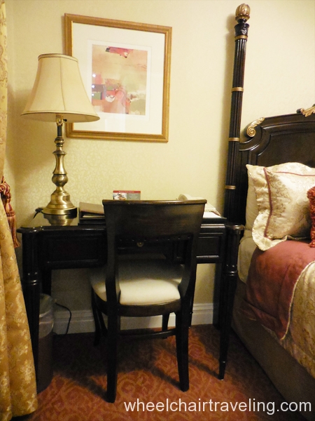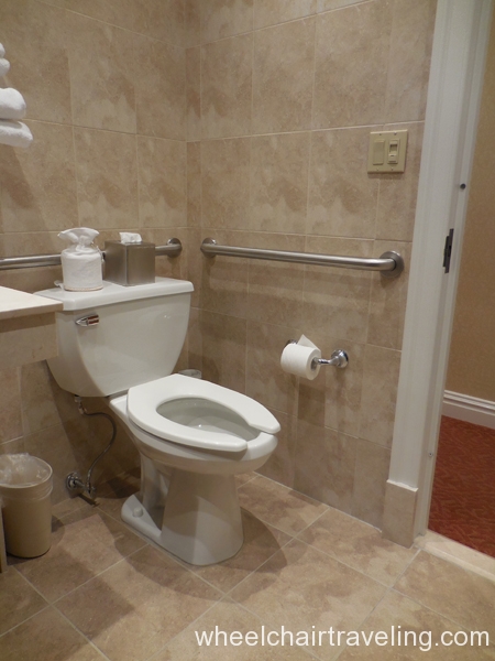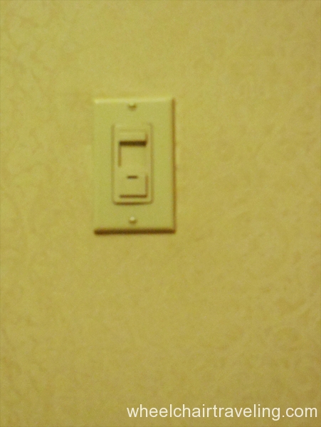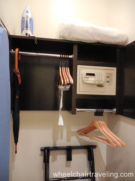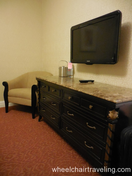 The light-weight door opens with a card-key and had a lowered peep hole. The hallway isn’t wide but is just wide enough. In this hallway is the door to the bathroom and closet with a lowered bar for clothes. The bed area is setup to maximize maneuver space as much as possible with a desk directly next to the bed on the left side. The power outlet with the best access (closest) to the bed, is under the desk which is a bit awkward. Across from the bed are drawers, the television and the HVAC system. The HVAC system could be lowered for better access.