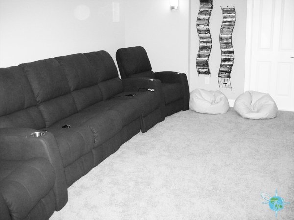 By wheeling down the driveway (or being driven in a car) to the back of the house, you can access the garage and the lower level of the house. The lower level includes a rec room and a beautiful theatre room with reclining seats and a 105” screen with projector. This level also is the start of a gentle paver pathway that winds its way down to the dock and the water.