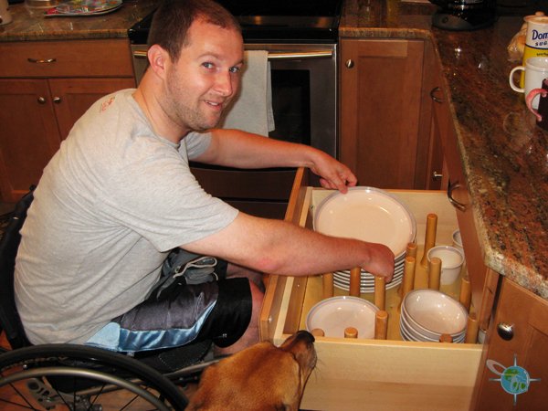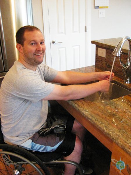 The house includes a ramp to the front porch to access the main level of the house. On that level there are two bedrooms, both with full, private bathrooms. One of the bathrooms includes a wheel-in shower with fold down seat and plenty of safety bars around the toilet. The sink cabinet includes a gap at the bottom for chair foot rests. The kitchen, also on the main level, includes two sinks. One has a fully open cabinet underneath for a wheelchair. There is also a pull out drawer for plate and bowl storage. Access to the deck (also with a slight ramp) is on this level.
