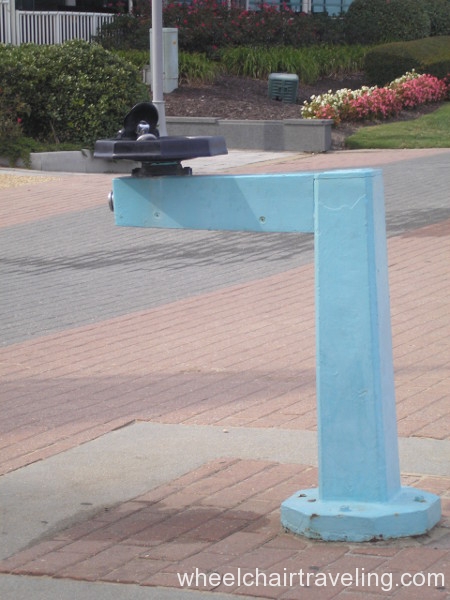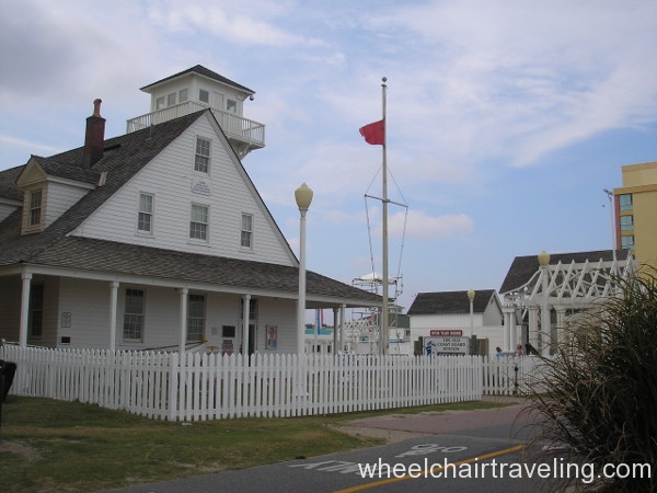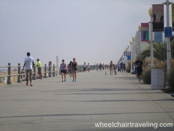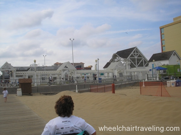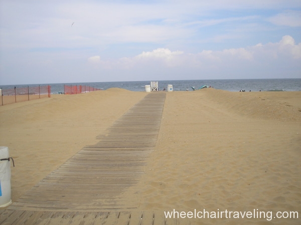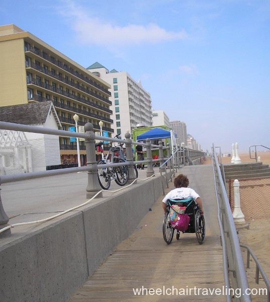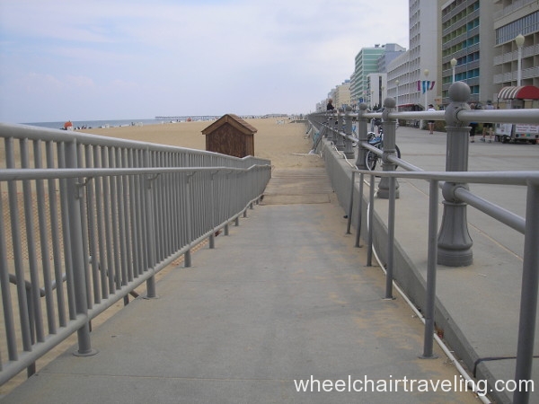 A few campgrounds advertising accessibility are located about 3 miles southeast of the beach on US Highway 60, “General Booth Blvd.”, which becomes Pacific Avenue. Try Holiday Trav-L-Park (757-425-0249) or Virginia Beach KOA (757-428-1444). Numerous national-chain hotel properties such as Hilton, Clarion, Days Inn, Hampton Inn, Holiday Inn and Comfort Inn are situated along Atlantic Avenue at the oceanfront and advertise accessible lodging – some with balconies overlooking the beach and boardwalk. A lot of these hotels provide direct access to the boardwalk, and some have on-site restaurants. Many additional restaurants, shops, and services like ATMs and drug stores are located along Atlantic Avenue and Pacific Avenue.