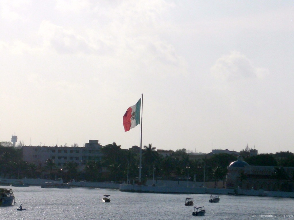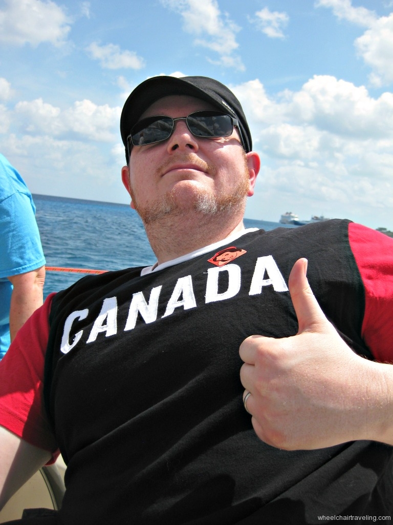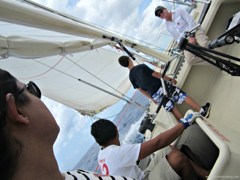 For our port stop in Cozumel, we booked the 12 Metre Regatta adventure. Yes I said regatta! Going into this we had no idea what to expect. The adventure description on DCL’s website said “Guests with collapsible wheelchairs can participate but must have someone accompany them who are able to assist with movements on and off of the vessels.” So we were adventurous and booked this excursion. Leading up to it, I was very nervous, as I wondered if I would be able to transfer to and from the boat, and little did I know just what I was in store for.