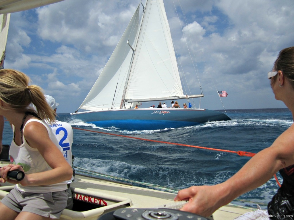 Once on the tender, they folded my chair and put it off to the side, and then proceeded to another pier to pick up some more guests that were going to participate on the regatta. They divided the groups into two teams, Stars & Stripes, and True North IV, and we got put on Canada’s boat True North IV; Yay Canada! Both yachts were anchored in the ocean, so you will need to be able to transfer from the tender to the yachts. As the boats are dealing with the water conditions, this may be challenging for those who don’t have good strength or balance issues, but the crew was very helpful. Once on board, the captain will assign everyone a role on the yacht (non-active roles are available, if you’re physically unable to do them). I was given the role of timer, and Candy was the cheer squad. After some pre-race drills, to make sure everyone knew what his/her role was, we started the race. Let me say this, you are an active participant in the race and the operation of the yacht. You will be grinding, winching, or trimming the sails, at specific points in the race. At some points in the race, the yacht will pitch at a steep angle, and for anyone who doesn’t have good balance or good leg strength (like me), you will have to brace yourself and hold on tight or risk falling overboard.