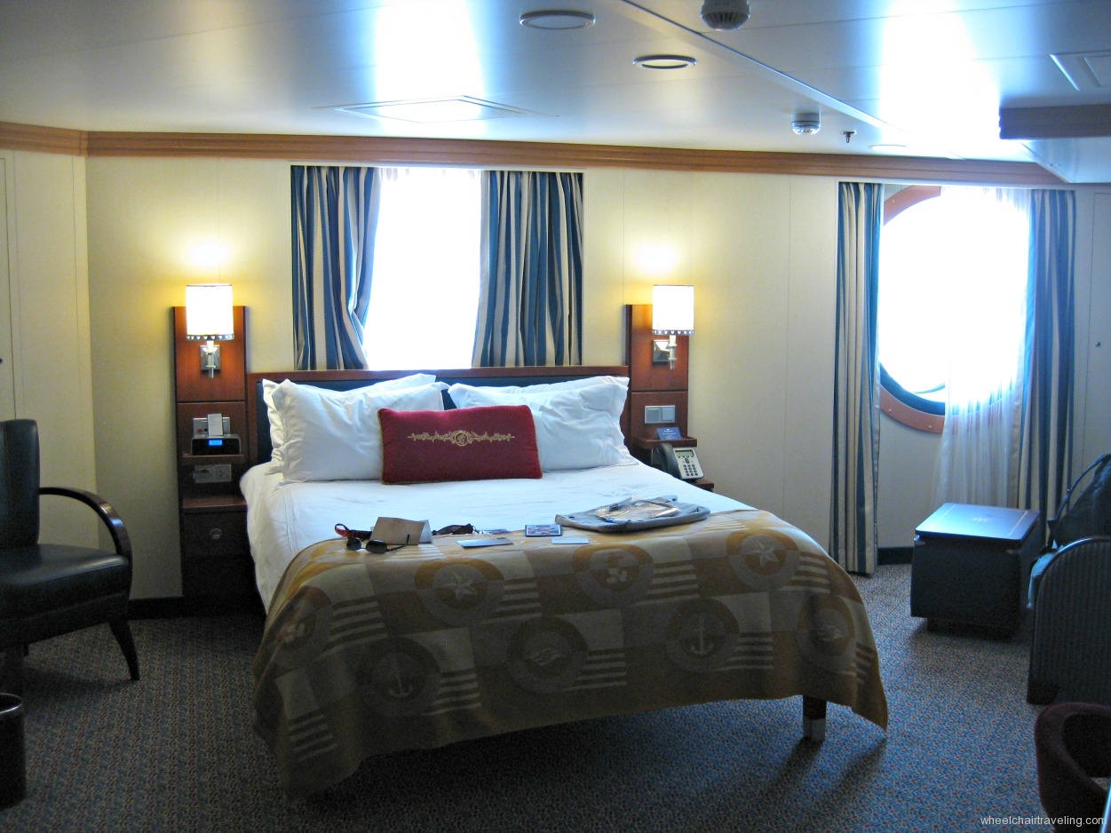 The Disney Fantasy, and her sister ship the Dream are larger than the Wonder and Magic. Both have 24 accessible staterooms, (20 Oceanview (2 are concierge rooms) & 4 Interior). We stayed in room 6686, which was an Inside Oceanview room located at the back of the boat, and like all the other wheelchair accessible rooms, provided ample space to maneuver the chair around the cabin, and washroom. This room didn’t have an outside veranda, but it had two large portholes that you could look out from. All accessible staterooms come with the following features (as described from DCL website):