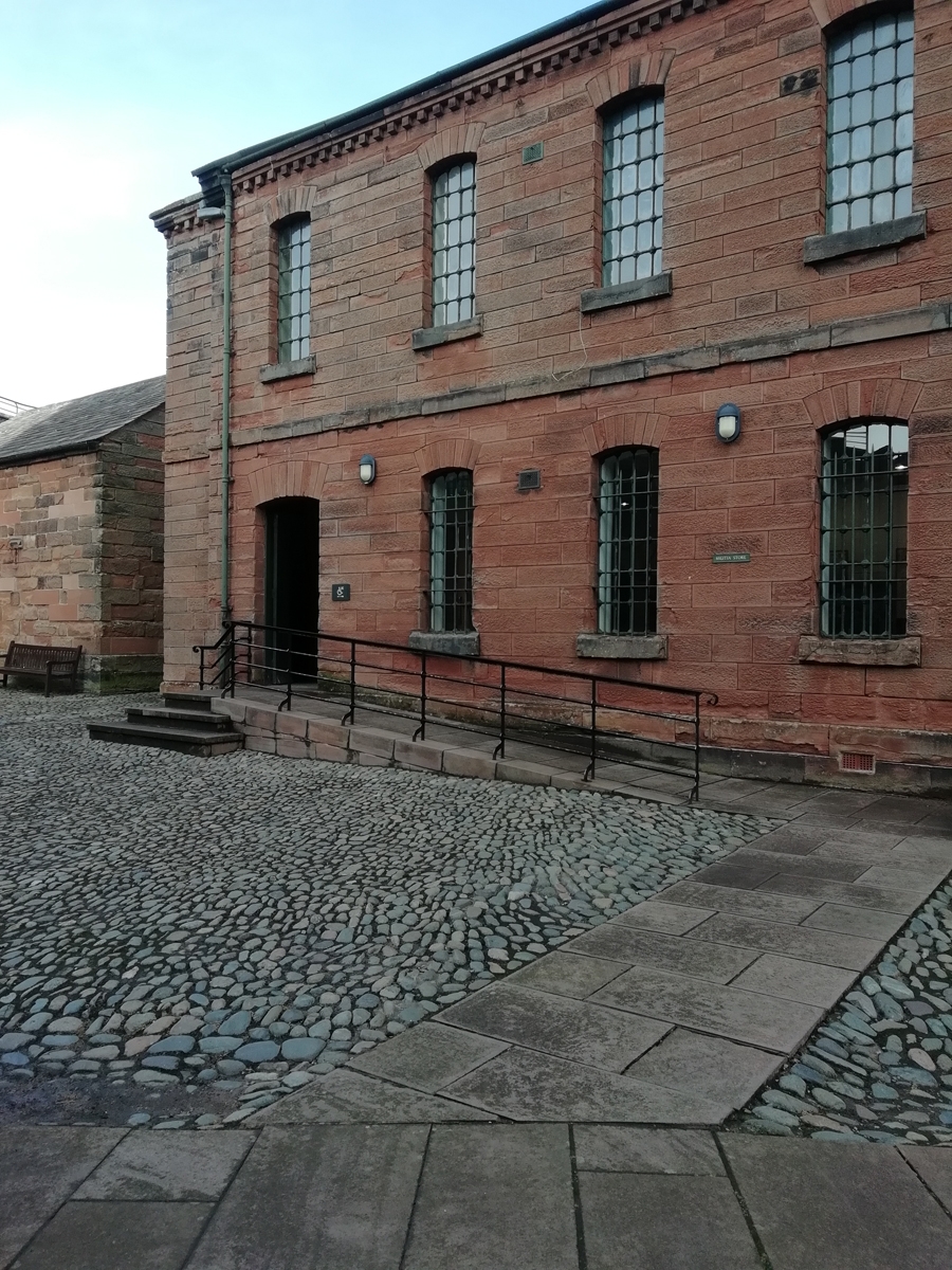 Carlisle Castle: Because of its proximity to Scotland, Carlisle was an important military stronghold. Carlisle Castle was built in 1092 by William II, the Castle is strategically located on the border between England and Scotland and has witnessed many attacks over its 900 year history, and once served as a prison for Mary, Queen of Scots. Despite its turbulent history, the Castle is still relatively intact. Once in the Castle Grounds, you have a great view of the inside of the Castle walls, however only the Castle exhibition itself is accessible (via a ramp). Inside the exhibition there is a single accessible toilet with grab rails and room to side transfer. The Castle holds events and a portable accessible toilet is available for use during these events. I found the accessible portable toilet to be large, with a small threshold, grab-rails and room to turn. However, with a mid-wheel drive powered wheelchair, I was quite far forward of the toilet bowl for transferring. With a manual chair or rear wheel powered wheelchair, that wouldn’t have been such an issue. Blue badge holders can drive into the castle grounds and park free of charge. Alternatively, if you are wheeling from the Cathedral or Tullie House, use the pedestrian crossing to cross Castle Way and then use the paved walkway over the cobbles, through the Inner Ward on to the Keep (where the exhibition is).
