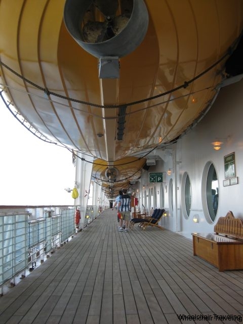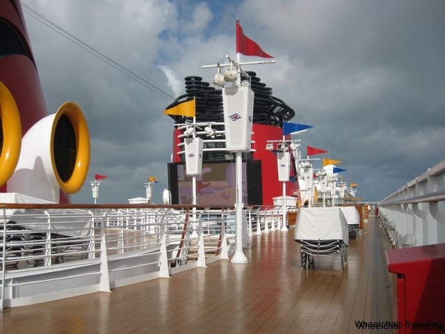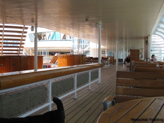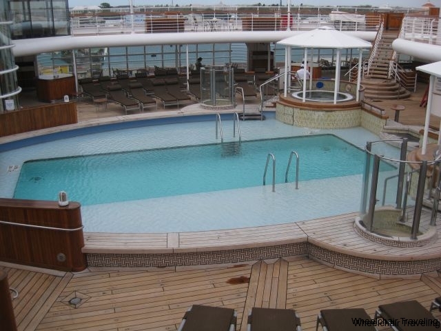 The outside deck has large enough walking lanes to maneuver a wheelchair or scooter around, without any need to move deckchairs or tables out of the way. In the main pool areas, you will have to deal with a lot of children and families walking and running around. As for the pools themselves, you have access up to all the pools on the ship. If requested, a lift chair is available to transfer you from your wheelchair into the pool.
