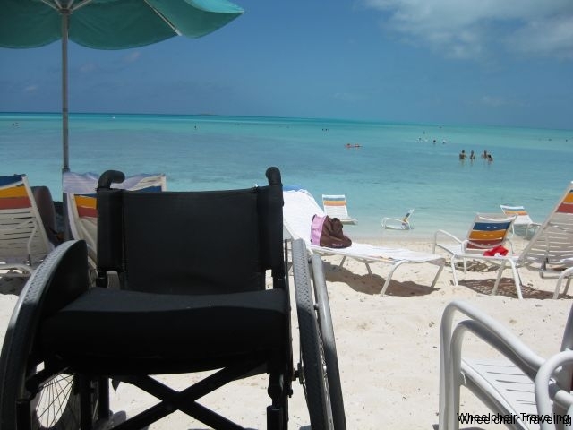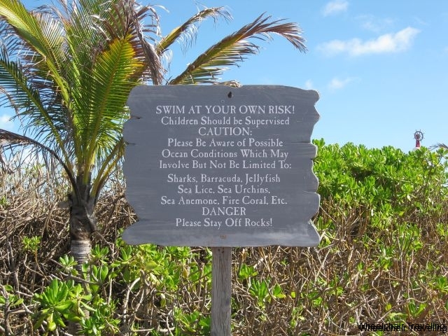 After our Stingray adventure, we made our way down to the Serenity Bay tram. Once it arrived, we got the drivers attention so he could lower the ramp in order for me to wheel up into the tram. The drive down to the far end of the island isn’t long, and you will actually go down an old abandoned runway to get to Serenity Bay. Here you will find the location for the 5k and bicycle paths. Once we arrived at Serenity Bay, we again had to get the drivers attention to let us off the tram. I recommend getting here as early as possible, as there are a limited number of hammocks, and lounge chairs close to the beach entrance. These fill up fast, and it means travelling further down the beach in order to find a place to sit and relax. Without a sand wheelchair, this will be problematic navigating thru the sand, as well as getting down to the water. The beach isn’t soft white sand; instead it’s full of shells and rocks, so keep that in mind if you’re going to make your way out into the shallows. I recommend water shoes or close fitting sandals so you don’t hurt your feet.