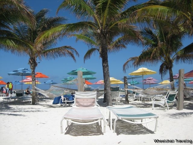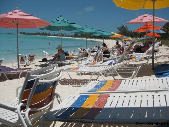 There are three beaches for guests: one for families, one for families and teens, and another exclusively for adults. You will be able to access the first two beaches from the main part of the island, but will either have to walk to the far end or take another tram to Serenity Bay. Disney provides a limited number of complimentary beach wheelchairs, to allow guest to ability to maneuver on the sand. These are first come, first served – they cannot be pre-booked. There are multiple washroom locations throughout the island, and most will have one large stall, but with a tilted mirror, and some handrails. The stall door locks may be hard to close for those with dexterity issues, as it is a tiny latch lock.