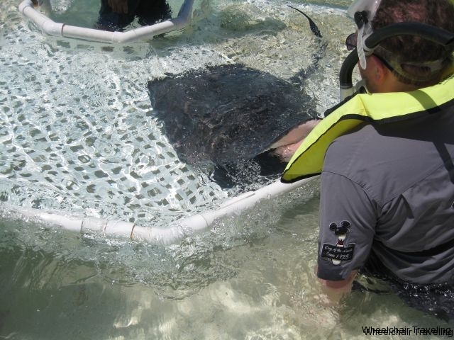 A variety of shore excursions are available to book before or on the island. These include bicycle and/or personal watercraft rental, cabana with or without massages overlooking the ocean, snorkeling, para-sailing, volleyball and basketball, etc… Again, with each excursion, there will be restrictions on accessibility. We booked a Stingray Adventure, which got you up close and personal with stingrays, allowing you to touch and feed them. You will need to transfer to a sand wheelchair or walk down to the water in order to participate in this excursion. After feeding, you also have the chance to head further out into the lagoon to snorkel with more stingrays. All the rays here have all been de-barbed, but you still have to be mindful of not getting your fingers to close to their mouth, as it can hurt if they close down on your finger.
