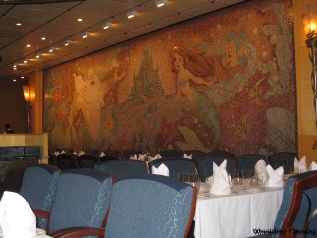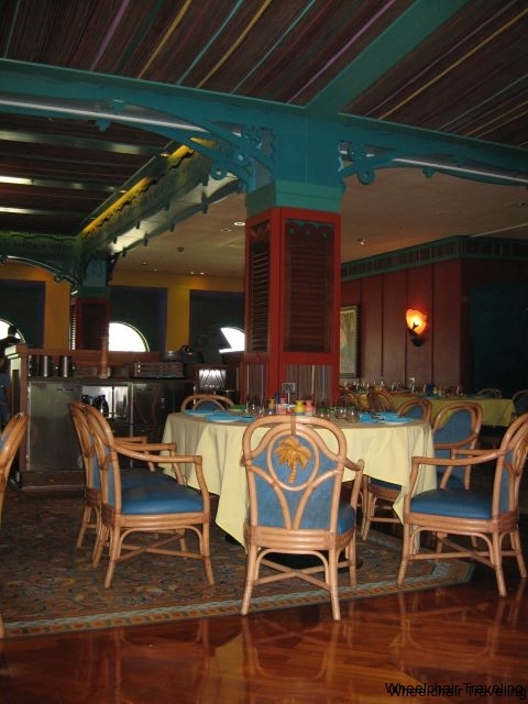 Disney uses a rotational dining system, which means you eat in a different location every night. Your serving staff rotates with you, so they can get to know everyone’s likes and dislikes when it comes to how they want their food prepared, food allergies and drink choices. You rotate between 3 locations; Parrot Cay, Lumiere’s and Animator’s Palate, each has its own theme with a Disney look and feel. Like any restaurant, your table might be located on the main pathway, or tucked away in the corner. On this cruise, I don’t know if the booking agent missed that we were in an accessible stateroom as our table location was in the back corner. This posed a bit of a problem, navigating my chair past all the other tables that had guests already seated. It would have been more of a problem for someone in a larger electric chair or wider wheelchair. Since our first cruise, this hasn’t happened again, and every other table location has been right off a main path, thus making it easy to access the table and to transfer into a regular chair.