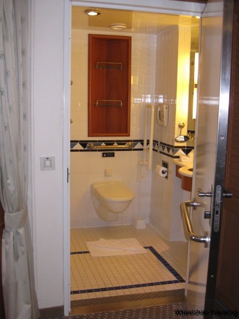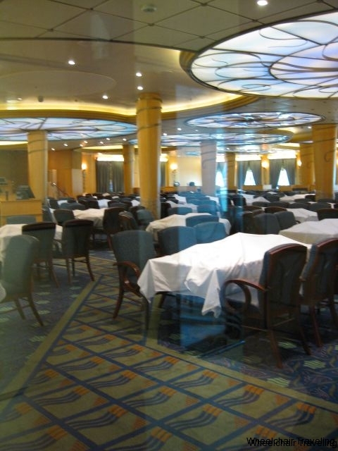 Boarding the ship was easy, as the gangplank from the terminal to the ship was at a gradual grade and had plenty of space to maneuver any type of wheelchair, manual or powered. Once on the ship you’re welcomed aboard, and are directed to various restaurants for lunch, or you have the ability to find food on the pool deck to grab a snack. Use this time to get a deck plan and get familiar with the location of the elevators, accessible washrooms, your stateroom, as it will save you time getting around. Some elevator locations have a higher traffic level than others – ie any of the ones in the Atrium. This will be very important with a wheelchair, as the elevators are small, and you may be waiting a while to get one that can fit the chair. I will go into more details later on about the layout of the ship. In addition, check out the ship’s Navigator so you can determine the time of the sail away party and any additional activities happening that evening.