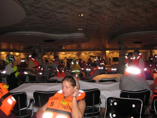 Before the ship leaves port, there is a mandatory emergency evacuation drill that all guests and crew members must perform. On your KTTW card, you’ll see a prominent letter in the lower left quadrant. This letter corresponds to your mustering station. During the drill, make your way to that station – there are Cast Members to help direct you along the way. Depending on your stateroom location, your mustering station might be on another deck. For the drill, I was able to use the elevator to get down to our station, but in the real event of an emergency, elevators will not be available and you will need to use the stairs.