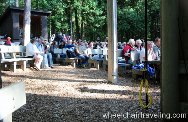 Accessibility in the theater is limited but upon entering the parking area, disabled ticket holders will be provided directions to the disabled parking where you are then escorted along the side of the stage on a short wood-chip packed path to your seats. Food and beverage is sold however the stand is at the top in the back of the theater. I would suggest having someone able-bodied with you to provide any additional assistance.
