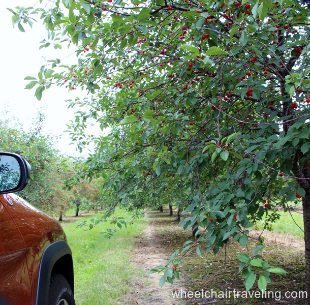 Door County, like the rest of Wisconsin, is rich in fertile farmland which is one reason why Door County annually remains one of the country’s top producers of tart cherries, the same cherries used in most recipes and mid-July just happens to be cherry picking season, so I wanted to be sure I had an opportunity to pick some cherries before my vacation was over. We asked around during the week to find out when and where we could pick our own cherries. One place that was recommended to us was Choice Orchards in Sturgeon Bay. Upon arrival at Choice Orchards, we checked in to receive our cherry bucket and were given directions to the cherry orchards where we were able to drive up right next to the trees giving me just mere feet to maneuver my wheelchair before reaching the trees. The trees were so full of fruit it took us under an hour to fill our 5-pound bucket.