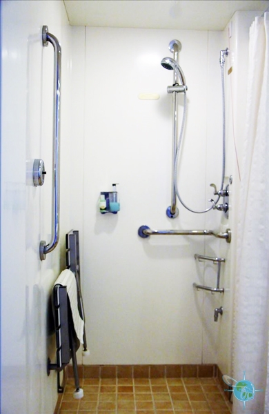 For this cruise I once again selected a balcony stateroom on the Port (left) side. I had researched the ports we would be at and found the Port side would provide the most scenery while in port. It also allows me to boat and people watch while docked in Port Everglades. My stateroom was on Deck 14, right outside the forward elevators. Upon entering my spacious stateroom I did a quick check to ensure I could reach everything adequately and took down one of the life vests to place by the bed, a precautionary measure I take when cruising alone. My accessible bathroom had two emergency pull cords, one by the toilet and the other in the roll-up shower. Grab bars were located all around the toilet and roll-up shower. The sink provided me with ample room to wheel-up under. As with my previous staterooms, I had a queen-size bed, desk that allowed me to roll-up under and the balcony had a flap that would extend over the lip when the door was opened. The only obstacle was an extra chair that I asked my Cabin Steward to remove.