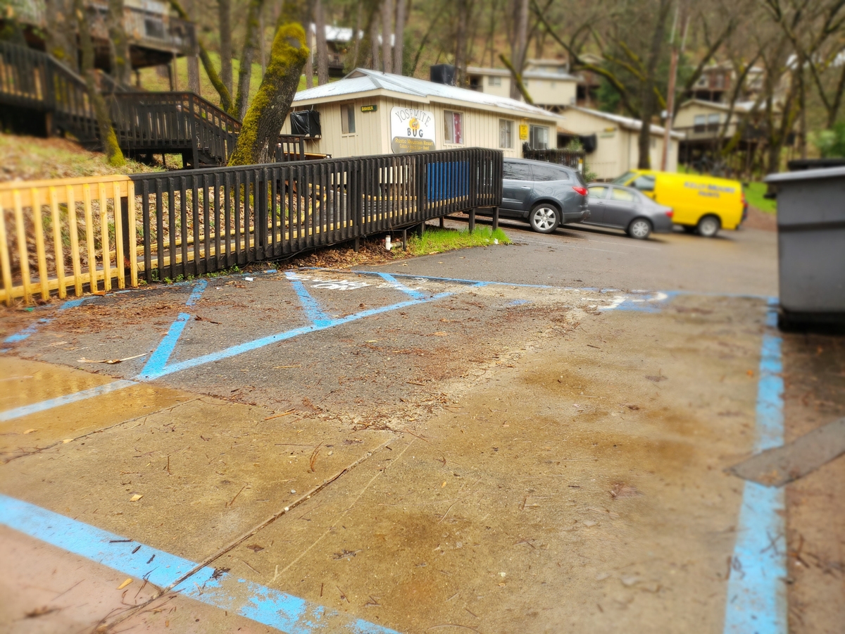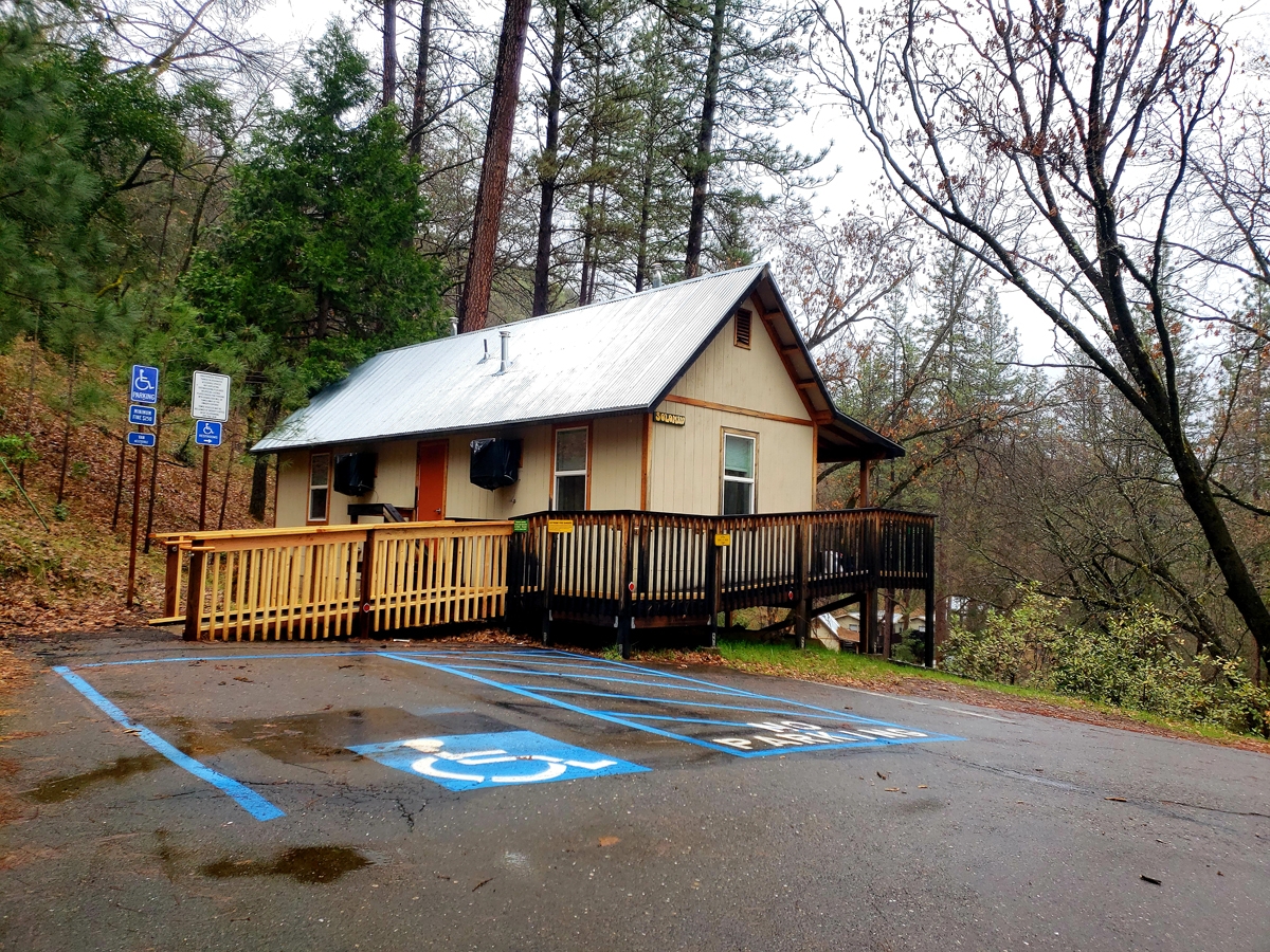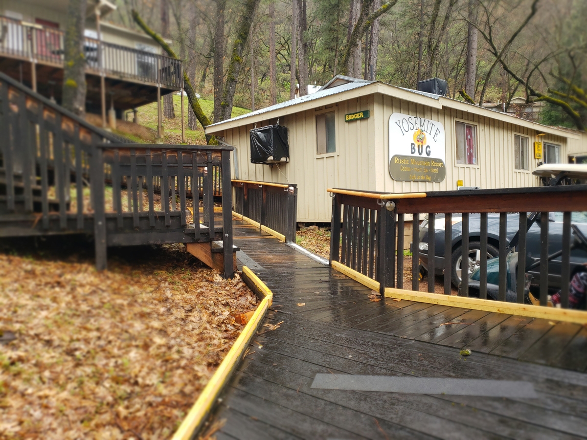 - Office: The Yosemite Bug Office is located across the restaurant/café where there’s also the designated ADA parking spot. A ramp leads around the door of the office; the office has no modifications but staff will assist by providing a clipboard for any signatures. Merchandise can be purchased here as well as any yoga or spa treatment sessions.