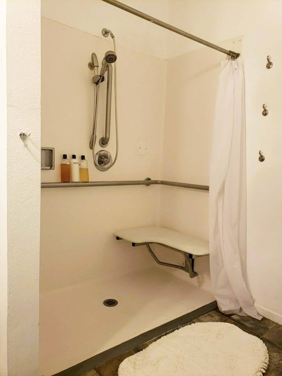 - Bathroom Shower: Roll-in with a padded, mounted bench and hand-held nozzle.