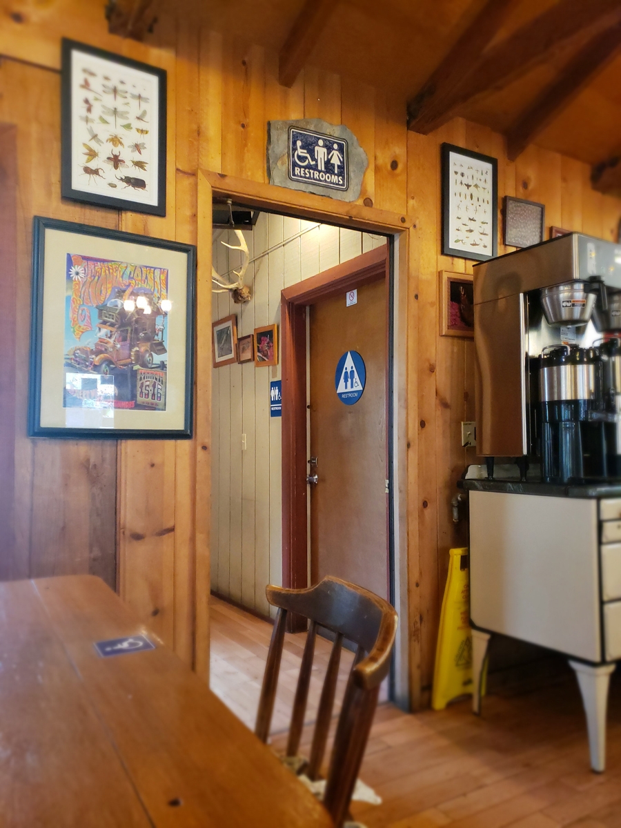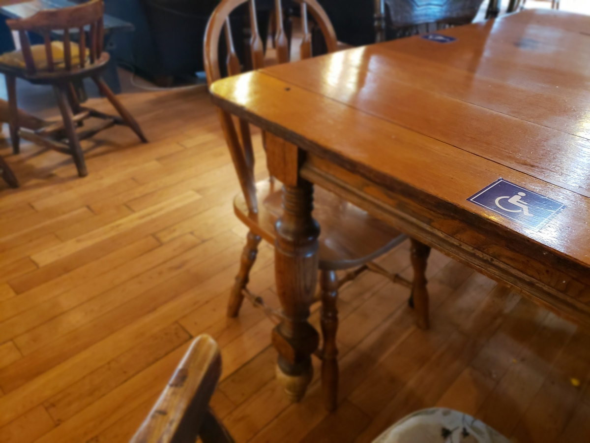 - Restaurant/ Café: Open for breakfast, lunch and dinner and serves homestyle cooking. Different kinds of pies and the inhouse teas are exceptional. Two tables in the main dining area are at a height for wheelchair access, and there’s also an ADA toilet. Accessible parking just outside the barrier-free entrance.