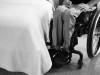 The twin beds in room #4501 were each laid up against the wall on opposite sides of the room to maximize the space in between. These beds were also at a good transfer height. Like the other room, the roll-up sink is separate from the toilet and roll-in shower area. The door to the toilet and shower area has a sliding wooden door with a large handle. It also has a permanent padded shower bench built into the wall. Furthermore, although there is a lowered closet bar, the hangers do not come off which can make it difficult to hang up one’s clothes.